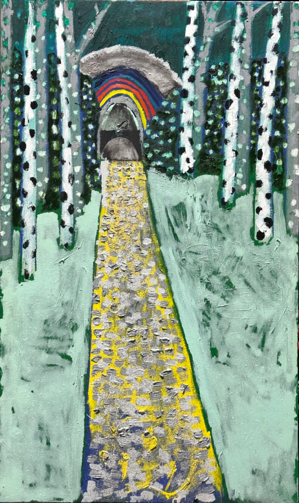 The yellow Brick Road, What a pleasure to ride, Cobblestone Mirage(Nightvision Wile E., Coyote), 2025oil, acrylic, gloss, spray paint and glitter on cotton duck on wooden board100 x 60 cm